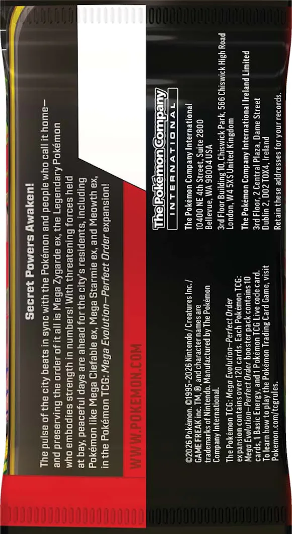 Release Date: 27th March 2026 Pokémon TCG: Mega Evolution Perfect Order Booster Box Harness overwhelming power and precision with Mega Evolution Perfect Order, a dynamic Pokémon TCG expansion focused on Mega Evolution Pokémon and structured, high-impact gameplay.This booster box is perfect for players looking to strengthen competitive decks and collectors chasing powerful cards featuring iconic Mega-Evolved Pokémon. Whether you’re opening packs or holding sealed product, Perfect Order delivers consistency, strength, and exciting pulls. Product Details: Set Name: Mega Evolution Perfect Order Language: English Contents: 36 Booster Packs per Box (standard English format) Cards per Pack: 10 Cards + Energy Condition: Factory Sealed Manufacturer: The Pokémon Company Highlights: Features powerful Mega Evolution Pokémon Designed to support structured, competitive deck strategies Includes rare, ultra-rare, and secret-rare chase cards Ideal for competitive players, collectors, and sealed box enthusiasts Take control of the battlefield and build with confidence using the Mega Evolution Perfect Order Booster Box.