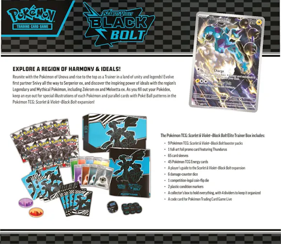 Release: 18th July 2025 Explore a Region of Harmony & Truth!Reunite with the Pokémon of Unova and rise to the top as a Trainer in a land of unity and legends! Evolve first partners Tepig and Oshawott all the way to Emboar and Samurott, and discover the undeniable power of truth with the region’s Legendary and Mythical Pokémon, including Reshiram ex and Keldeo ex. As you fill out your Pokédex, keep an eye out for special illustrations of each Pokémon and parallel cards with Poké Ball patterns in the Pokémon TCG: Scarlet & Violet—Black Bolt & White Flare expansion! This Listing is for a Pair of ETB's (1 of each variant) The Pokémon TCG: Scarlet & Violet—White Flare Elite Trainer Box includes: 9 Pokémon TCG: Scarlet & Violet—White Flare booster packs 1 full-art foil promo card featuring Tornadus 65 card sleeves 45 Pokémon TCG Energy cards A player’s guide to the Scarlet & Violet—White Flare expansion 6 damage-counter dice 1 competition-legal coin-flip die 2 plastic condition markers A collector’s box to hold everything, with 4 dividers to keep it organized A code card for Pokémon Trading Card Game Live The Pokémon TCG: Scarlet & Violet—Black Bolt Elite Trainer Box includes: 9 Pokémon TCG: Scarlet & Violet—Black Bolt booster packs 1 full-art foil promo card featuring Thundurus 65 card sleeves 45 Pokémon TCG Energy cards A player’s guide to the Scarlet & Violet—Black Bolt expansion 6 damage-counter dice 1 competition-legal coin-flip die 2 plastic condition markers A collector’s box to hold everything, with 4 dividers to keep it organized A code card for Pokémon Trading Card Game Live