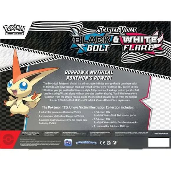 Release Date: 18th July 2025 Borrow a Mythical Pokémon’s Power!The Mythical Pokémon Victini is said to create infinite energy that it can share with its friends, and now you can team up with it in your own Pokémon TCG decks! In this collection, you get an illustration rare-style foil promo card and a premium parallel foil card featuring Victini, along with an oversize card for display. You’ll find even more Pokémon from the Unova region inside the included booster packs from the special Scarlet & Violet—Black Bolt and Scarlet & Violet—White Flare expansion. The Pokémon TCG: Unova Victini Illustration Collection includes: 1 full-art foil promo card featuring Victini 1 premium parallel foil card featuring Victini 1 oversize illustration rare-style foil promo card featuring Victini 2 Pokémon TCG: Scarlet & Violet—Black Bolt booster packs 2 Pokémon TCG: Scarlet & Violet—White Flare booster packs A code card for Pokémon TCG Live